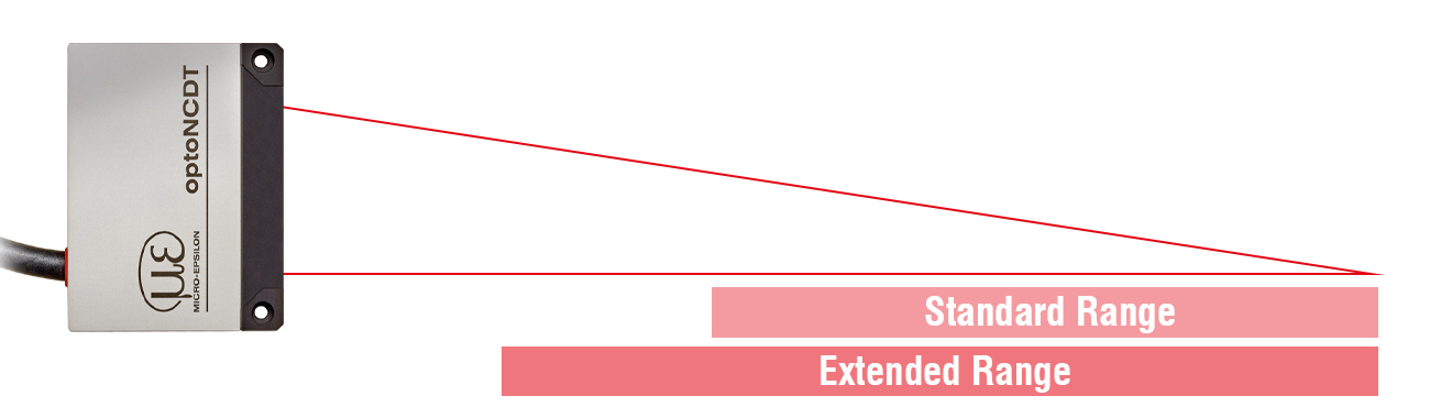 Die optoNCDT 5500 Sensoren sind mit unterschiedlichen Messbereichen verfügbar. Über den Standard-Messbereich hinaus kann ein erweiterter Messbereich genutzt werden, wodurch das Anwendungsspektrum deutlich erweitert wird. Dank der IP67 Schutzart und der hohen Fremdlichtbeständigkeit kann der Lasersensor auch unter schwierigen Umweltbedingungen eingesetzt werden.